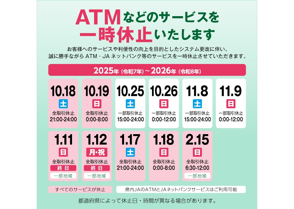 - システム更改に伴うATM・JAネットバンク等サービス一時休止について