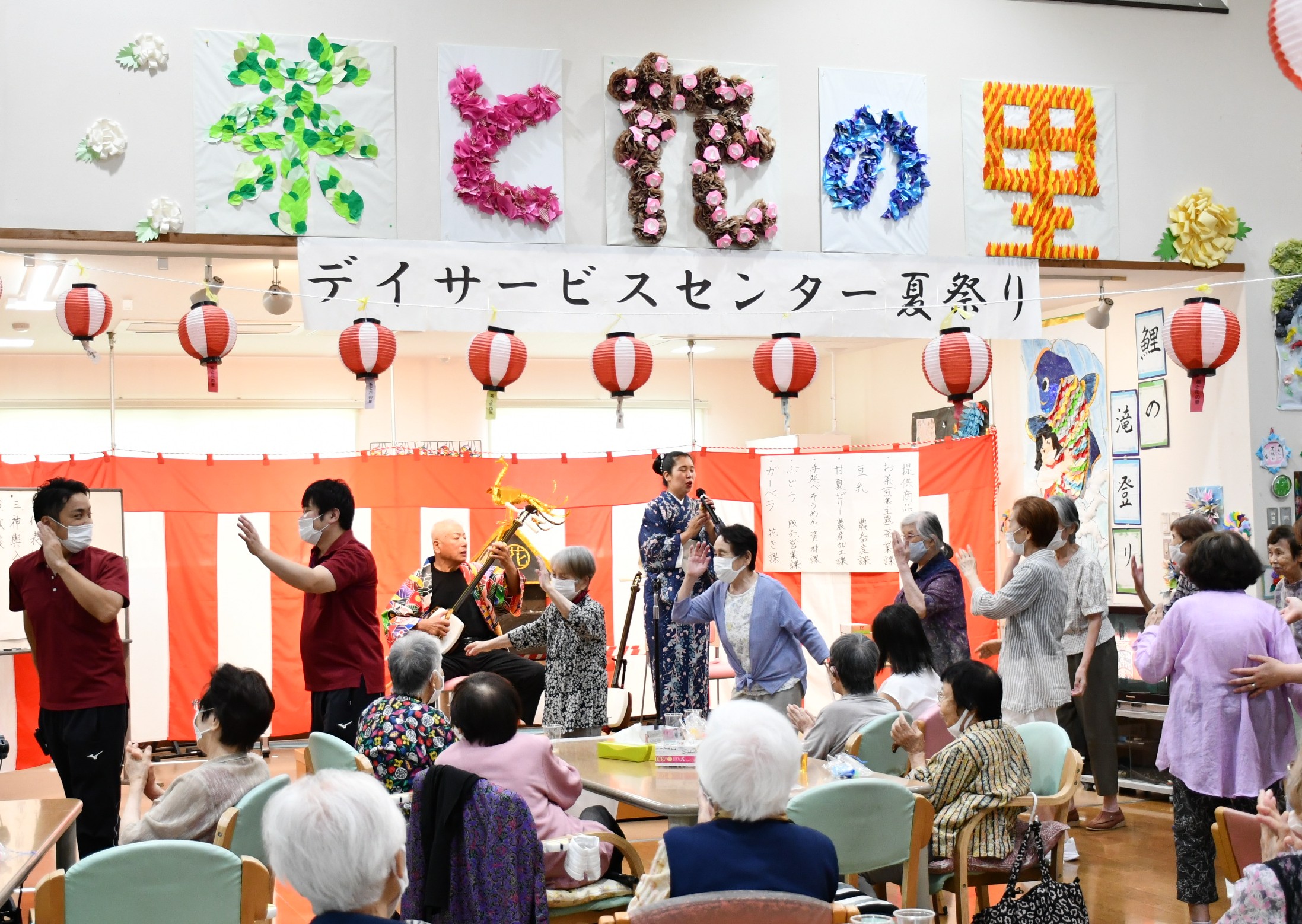 JAのデイサービスセンター「茶と花の里」は7月7日と15日、同センター内で「夏まつり」を開催しました。両日合わせて約80人の利用者と利用者家族が来場し、にぎやかな雰囲気の中で交流を深めました。