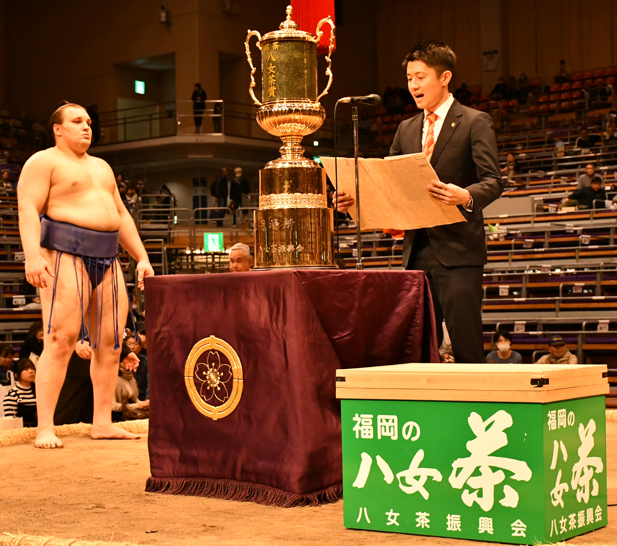 JAや管内の行政、茶業関係者らで構成する八女茶振興会は11月23日、福岡市の福岡国際センターで行われた大相撲九州場所千秋楽の表彰授与式で、優勝したウクライナ出身の安青錦関に「八女茶賞」を贈呈しました。