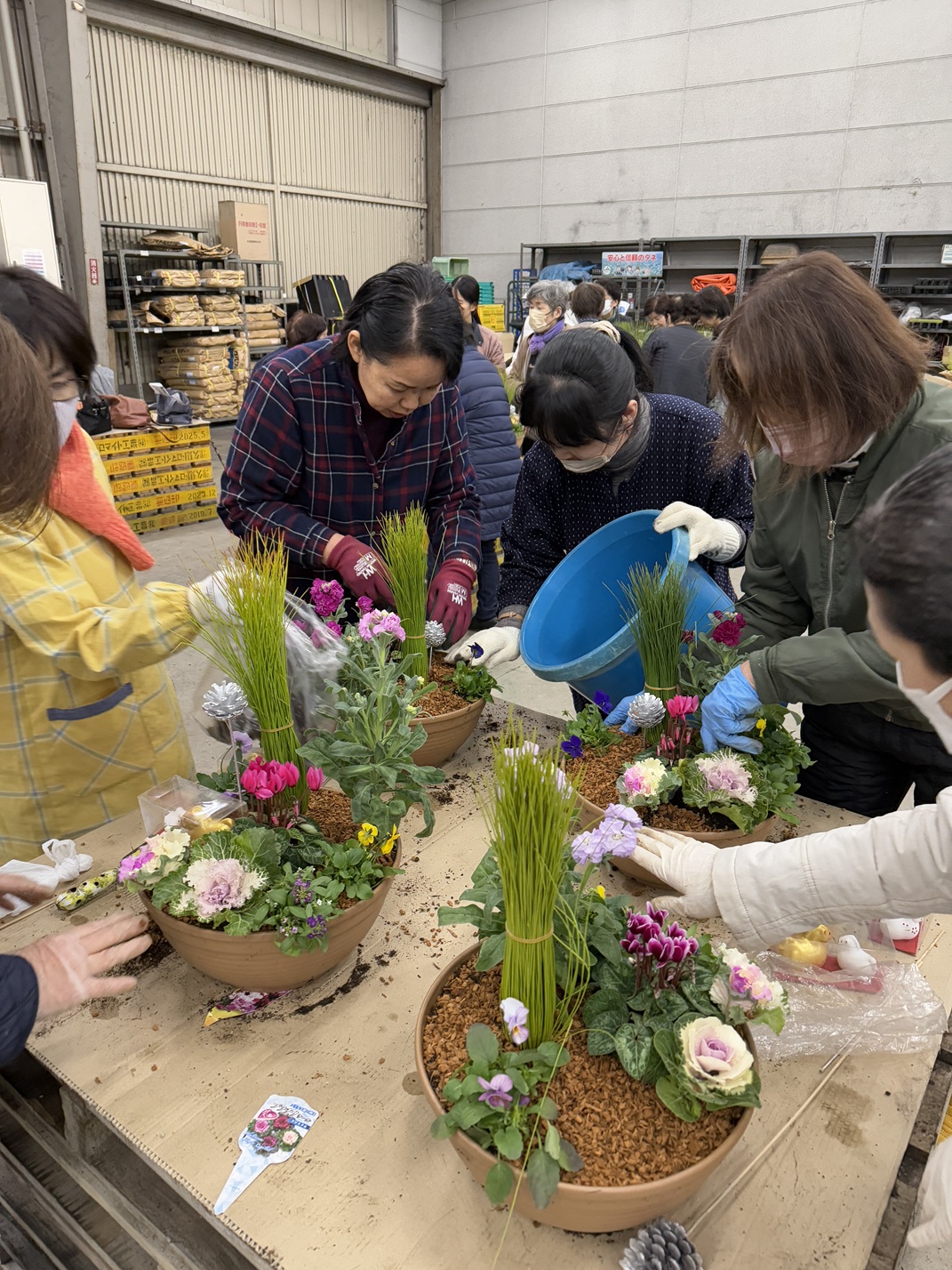 色とりどりの植物や縁起物を使いながら、参加者の皆さんは真剣な表情で、そして楽しく作業に取り組んでいました。「新しい年が素敵になりますように」と願いを込めて、世界にひとつだけのお正月飾りが完成。参加者からは「とても楽しかった」「自分だけの飾りができて嬉しい」といった声が聞かれました。