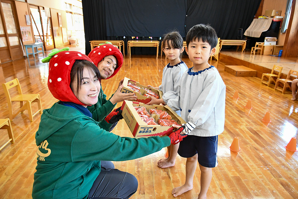 10日には、JA担当職員がイチゴの被り物をして保育園を訪問。ミツバチのおかげでイチゴができることを説明し、ミツバチに感謝の気持ちを持とうと呼びかけました。その後、「博多あまおう」を手渡すと園児らは笑顔で受け取りました。